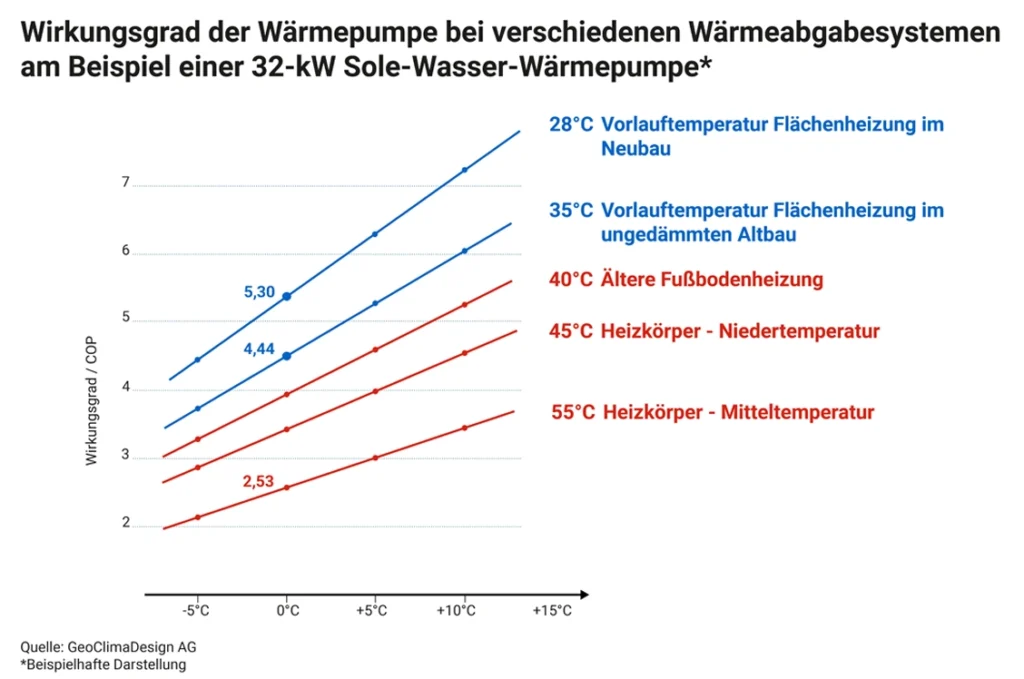 Sie planen eine Wärmepumpe oder haben bereits eine? Dann ist das Kapillarrohrsystem als Flächenheizung die logische Konsequenz. Die Grafik von GeoClimaDesign beweist: Der Wirkungsgrad ist unschlagbar.